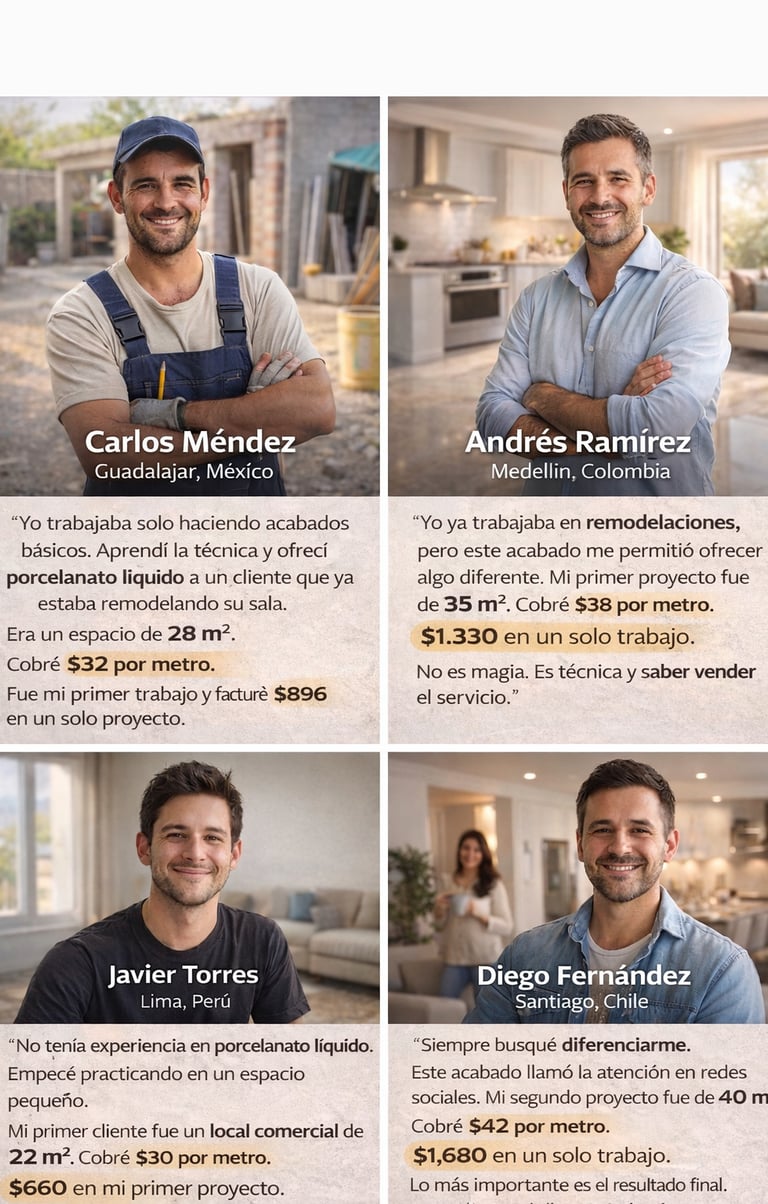 Estos son ejemplos reales del tipo de acabado que podrás ofrecer al dominar la técnica profesional de Porcelanato Líquido.